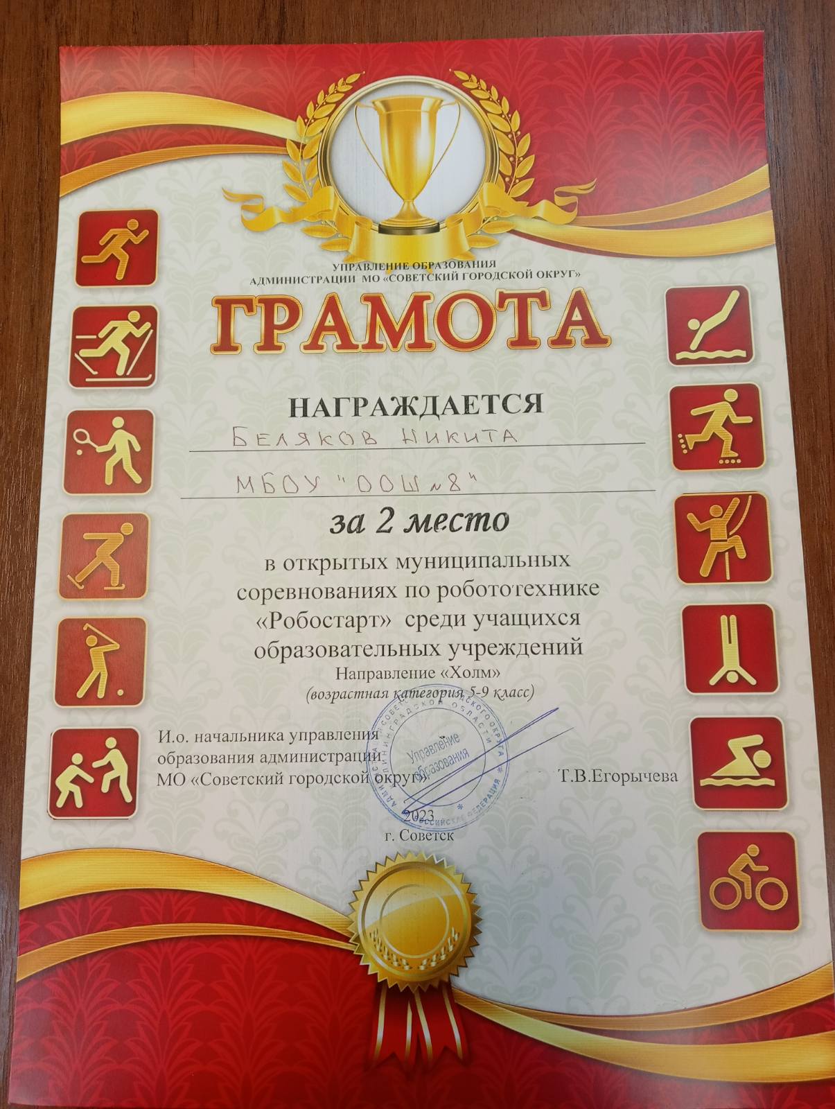 Грамота за 2 место в открытых соревнованиях по робототехнике "Робостарт"
