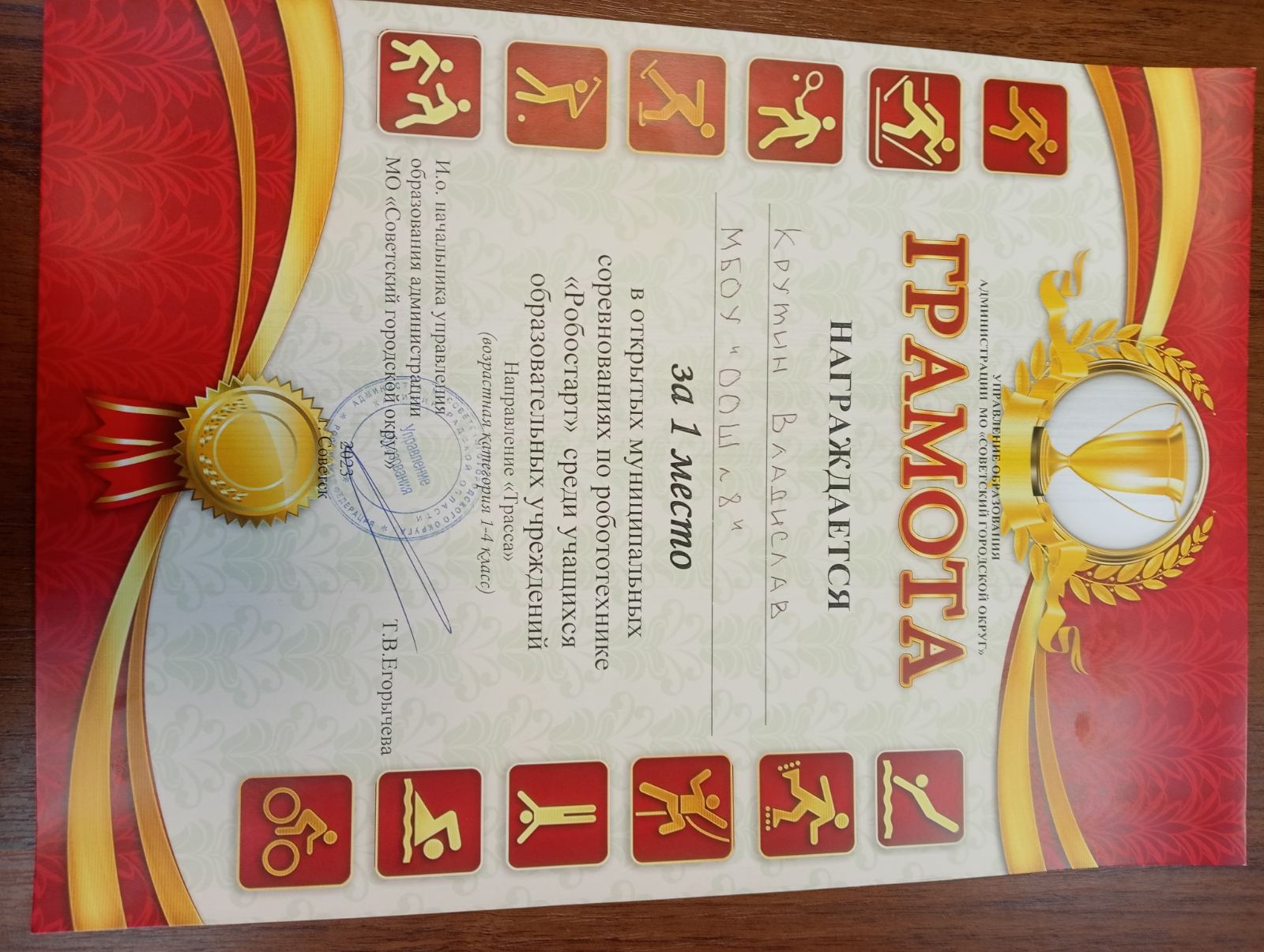 Грамота за 1 место в открытых соревнованиях по робототехнике "Робостарт"